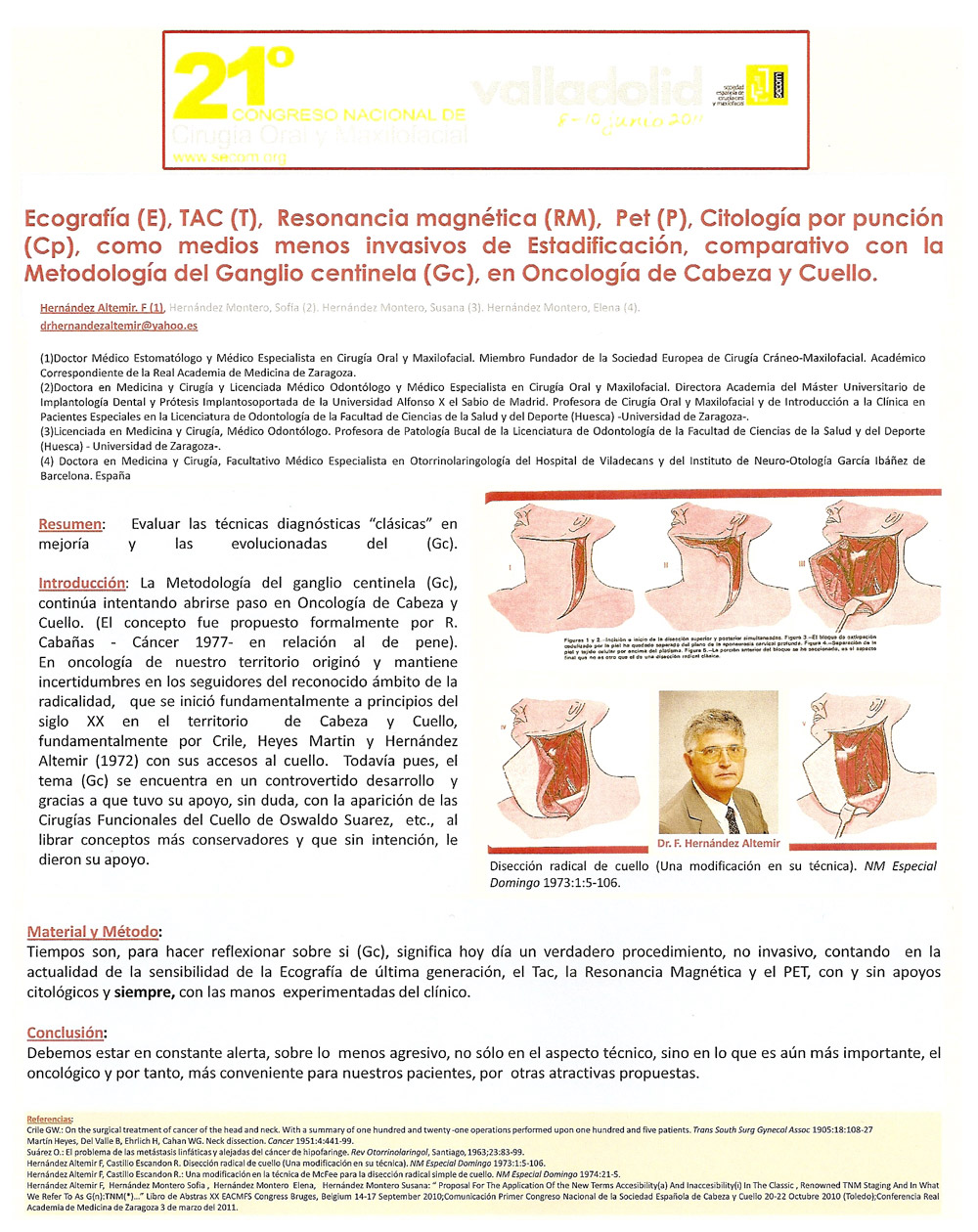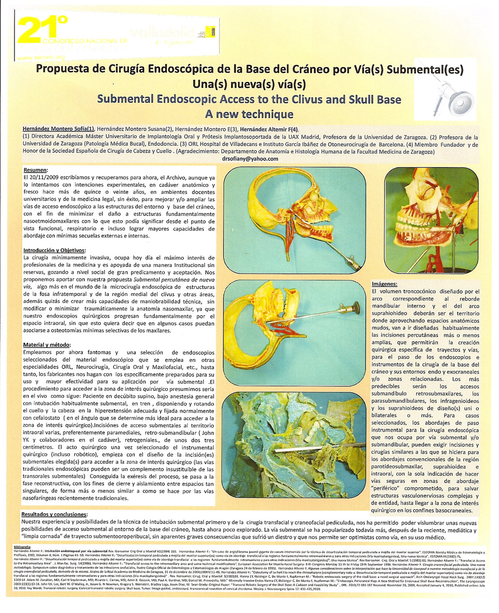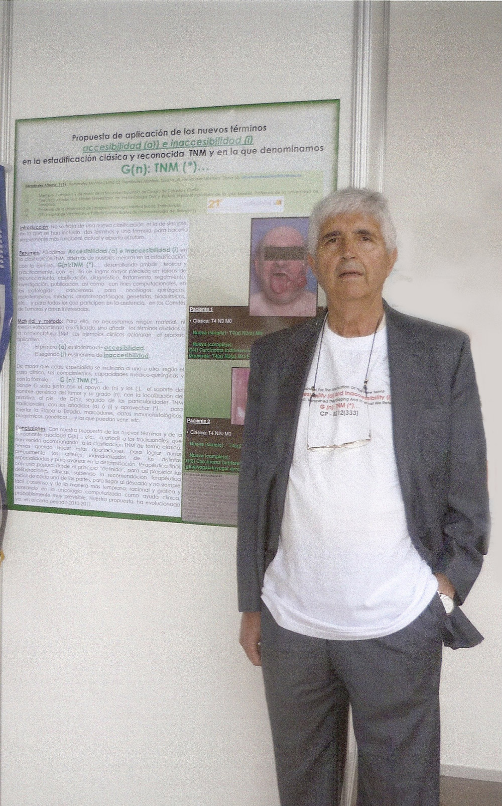 – The doctor. Hernández Altemir, “proposing” in a practical way, at the XXI Congress of the Spanish Society of Oral and Maxillofacial Surgery held in Valladolid del 8-10 of June 2011, what can you think of, incorporate into the Authors' Shirt (front and / or back or both), with the purpose of its better diffusion and informal discussion in the colloquial environments of Congresses, Symposium, etc., the Title of the Poster(s) and / or even part of it, or its entirety and all, because not few times, remain the same, a bit relegated and even “forgotten”, of the immediate scientific environment, on the panels that usually support them, although not for that, this exposure practice should be stopped, so classic and “effective”, without impairment, how not, to hang them in computer formats (already very experienced practice).